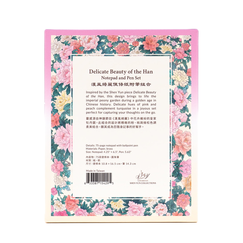 Được truyền cảm hứng từ tiết mục "Vẻ Đẹp Tinh Tế Của Người Hán" từ Shen Yun. Thiết kế này dẫn lối chúng ta trở về khu vườn hoa mẫu đơn trong hoàng cung nhà Hán - một trong những thời kỳ hoàng kim của lịch sử Trung Hoa. Sắc màu hồng đào tươi tắn, kết hợp với màu ngọc lam dịu mát, tạo nên vẻ nhẹ nhàng, thanh lịch - món quà lý tưởng để bạn ghi chép những khoảnh khắc cảm hứng mỗi ngày.