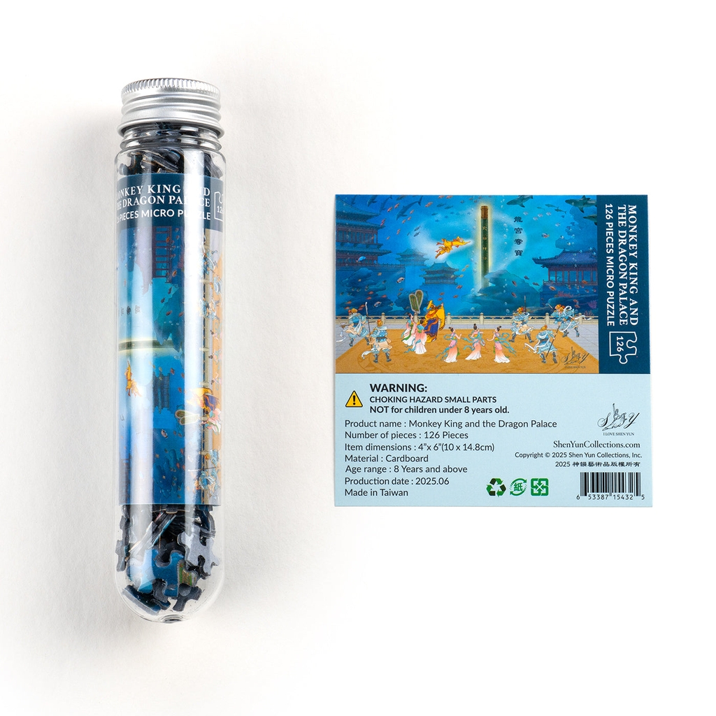 Nhân vật được yêu thích bậc nhất trong các tiết mục múa của Shen Yun — Tôn Ngộ Không — nay trở lại để mang đến niềm vui cho buổi sum họp gia đình của bạn qua bộ ghép hình 126 mảnh đầy hấp dẫn. Sinh ra từ hòn đá kỳ diệu, Tôn Ngộ Không được tôn làm Vua của muôn loài khỉ, sở hữu phép thuật phi thường. Bộ ghép hình nhỏ gọn này sẽ đưa bạn du hành xuống cung điện Long Vương dưới đáy biển, nơi Tề Thiên Đại Thánh vô cùng hứng khởi khi tìm thấy vũ khí hoàn hảo của mình — chỉ có điều, đó lại chính là cây cột đang giữ cho biển cả yên bình.