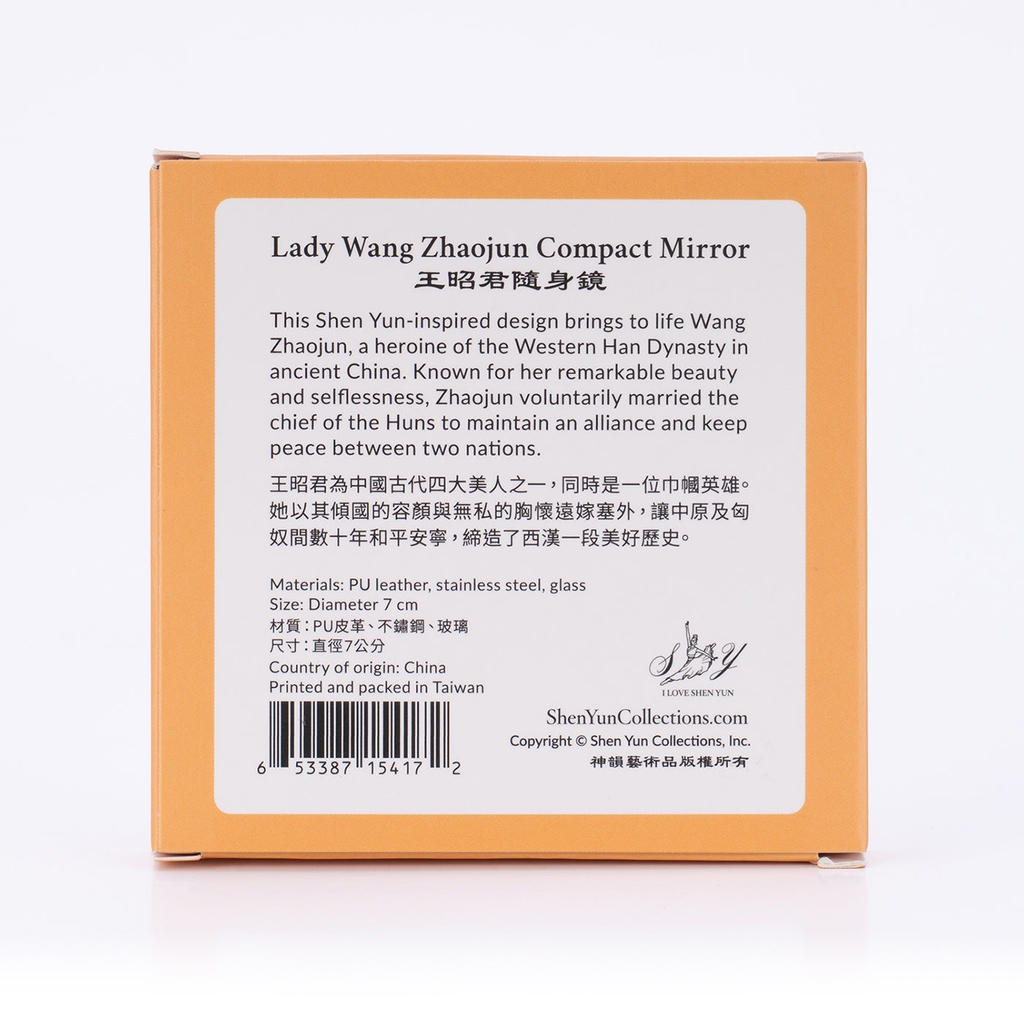 Khi đồng hành cùng bạn trong ngày, chiếc gương cầm tay lấy cảm hứng từ Shen Yun này tái hiện hình ảnh Vương Chiêu Quân, một nữ anh hùng tiêu biểu của triều Tây Hán. Nổi tiếng bởi vẻ đẹp tuyệt sắc và tấm lòng vị tha, Chiêu Quân đã tự nguyện kết hôn với thiền vu Hung Nô để duy trì hòa ước và giữ gìn sự yên bình giữa hai quốc gia.
