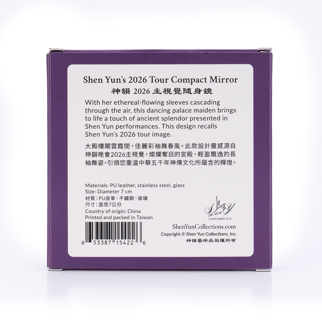 Với đôi tay áo dài thướt tha tựa dải mây đang uyển chuyển giữa không trung, nàng cung nữ đang múa này sẽ là người bạn đồng hành cùng bạn trong những hoạt động thường ngày. Mang đến hơi thở của vẻ đẹp cung đình cổ xưa được tái hiện trong các màn biểu diễn Shen Yun, thiết kế này gợi nhớ hình ảnh của tour Shen Yun 2026, được điểm xuyết bởi những họa tiết hoa cát tường lấy cảm hứng từ những mái vòm thiên giới rực rỡ trên phông nền sân khấu Shen Yun.