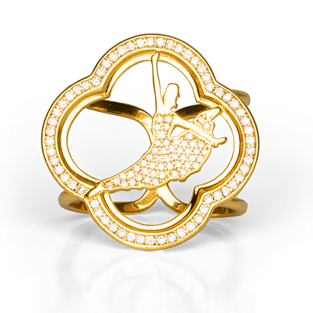Thiết kế được lấy trực tiếp từ logo của Đoàn Nghệ thuật Biểu diễn Shen Yun, chiếc nhẫn khăn này khắc hoạ hình ảnh nữ vũ công trong tư thế "Đại Xạ Yến", một trong những bước nhảy kinh điển trong những vở diễn của Shen Yun. Thông qua việc dàn dựng các điệu múa cổ điển Trung Hoa cùng những tác phẩm nguyên bản của Dàn nhạc Giao hưởng, Shen Yun đã chạm đến trái tim của khán giả đồng thời làm sống lại sự huy hoàng đã bị đánh mất của một nền văn minh tráng lệ.