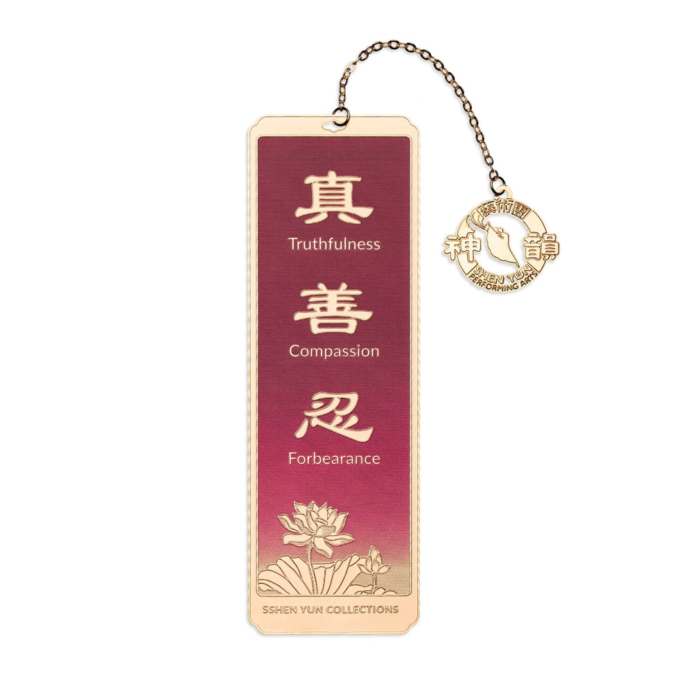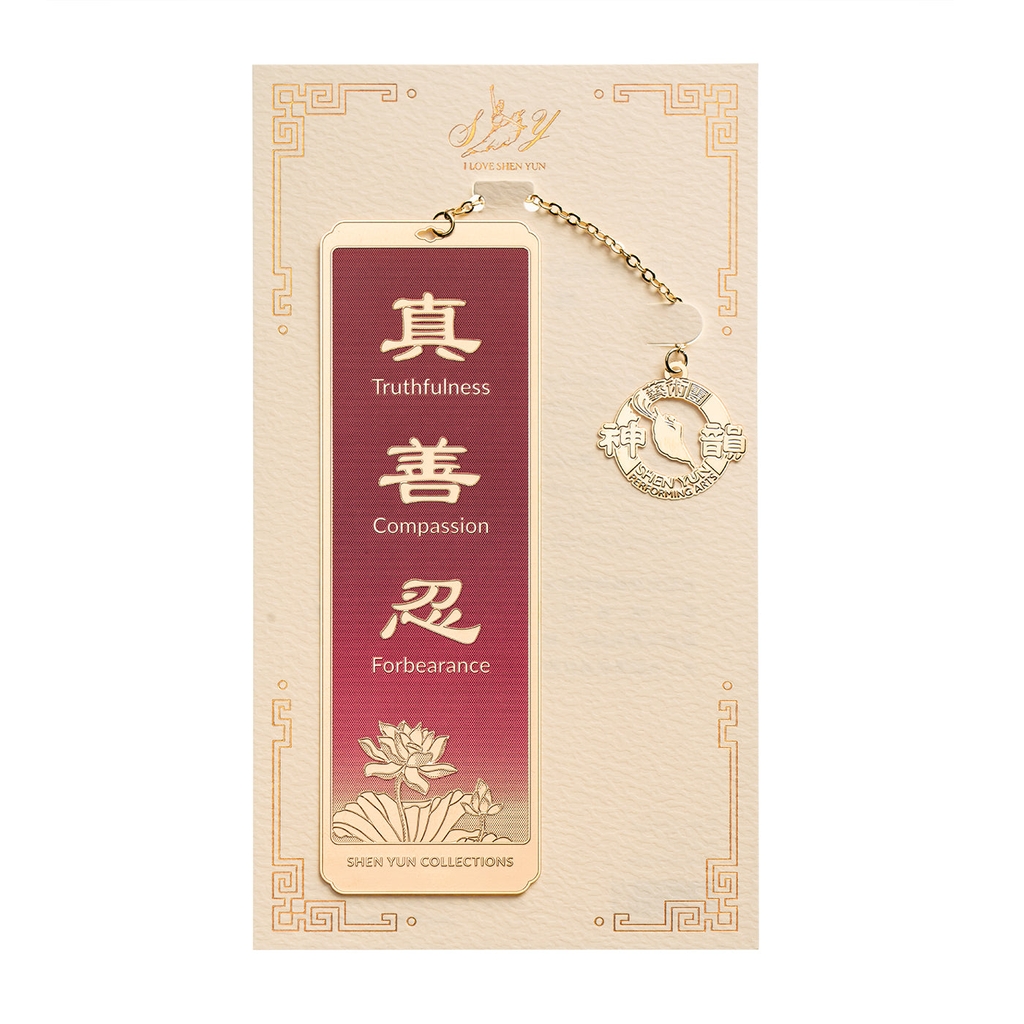 Một thiết kế tinh xảo với ba ký tự mang vẻ đẹp trang nhã. Chiếc thẻ kẹp sách duyên dáng này tôn vinh các giá trị phi thường, đó là 真 (zhēn) Chân, 善(shan) Thiện và 忍 (rĕn) Nhẫn. Đây là những đặc điểm thường được truyền tải trong các vũ điệu của Đoàn Nghệ thuật Biểu diễn Shen Yun (Thần Vận). Chúng tôi mong rằng hành trình mỗi ngày của bạn sẽ luôn toả sáng với một điều kỳ diệu vươn tới tận Thiên đường.