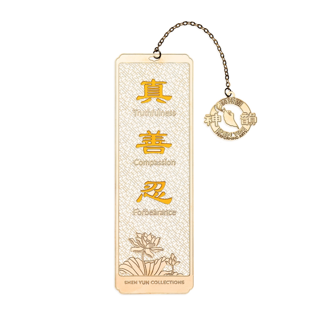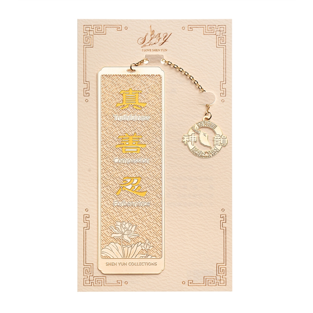 Một thiết kế tinh xảo với ba ký tự mang vẻ đẹp trang nhã. Chiếc thẻ kẹp sách duyên dáng này tôn vinh các giá trị phi thường, đó là 真 (zhēn) Chân, 善(shan) Thiện và 忍 (rĕn) Nhẫn. Đây là những đặc điểm thường được truyền tải trong các vũ điệu của Đoàn Nghệ thuật Biểu diễn Shen Yun (Thần Vận). Chúng tôi mong rằng hành trình mỗi ngày của bạn sẽ luôn toả sáng với một điều kỳ diệu vươn tới tận Thiên đường.