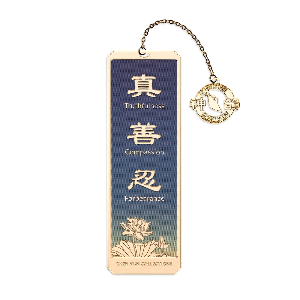 Một thiết kế tinh xảo với ba ký tự mang vẻ đẹp trang nhã. Chiếc thẻ kẹp sách duyên dáng này tôn vinh các giá trị phi thường, đó là 真 (zhēn) Chân, 善(shan) Thiện và 忍 (rĕn) Nhẫn. Đây là những đặc điểm thường được truyền tải trong các vũ điệu của Đoàn Nghệ thuật Biểu diễn Shen Yun (Thần Vận). Chúng tôi mong rằng hành trình mỗi ngày của bạn sẽ luôn toả sáng với một điều kỳ diệu vươn tới tận Thiên đường.